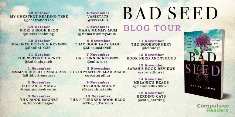 It is hard to believe that Bad Seed is a debut novel. Eames’ writing is so slick and engaging. I loved the way she combined psychological thriller with police procedural to allow the reader to see what was happening from all sides of the story so that we were able to make our own guesses as to the outcome. The novel is fast paced and Eames builds tension brilliantly with heart stopping moments at the end of each chapter.
