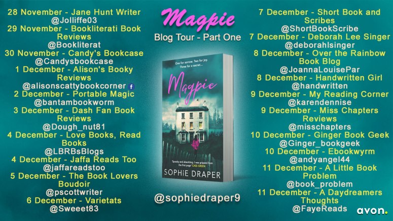 Today I’m pleased to be taking part in the blog tour for Magpie. My review is written with thanks to Sabah Khan from Avon Books for inviting me on the tour and for my copy of the book via Netgalley.