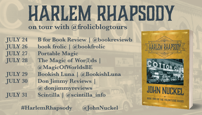 Today I’m delighted to be taking part in the blog tour for Harlem Rhapsody. My post is presented with thanks to Stephanie Caruso at Frolic Blog Tours for inviting me on the tour and of course, to John Nuckel, for writing his guest post.