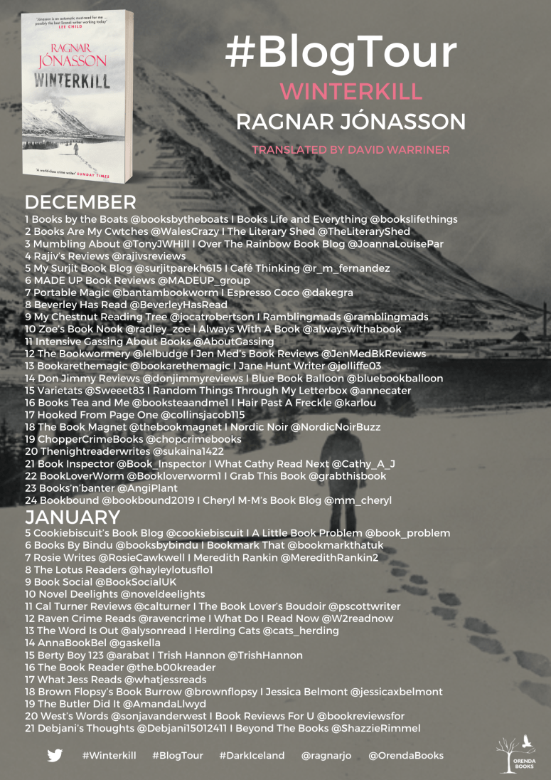 Today I’m delighted to be part of the blog tour for Winterkill. My review is written with thanks to Anne Cater for inviting me on the tour and to Orenda Books for my copy of the book.