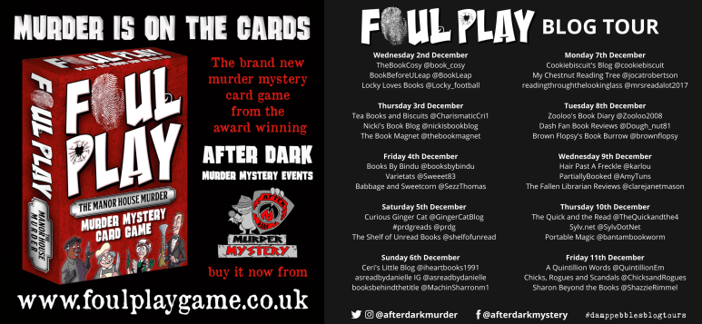 Today I’m delighted to be taking part in a blog tour for something a little different: a game! My review is written with thanks to Emma Welton of damppebbles Blog Tours for inviting me on the tour and After Dark Murder Mystery Events for my pack of Foul Play cards.