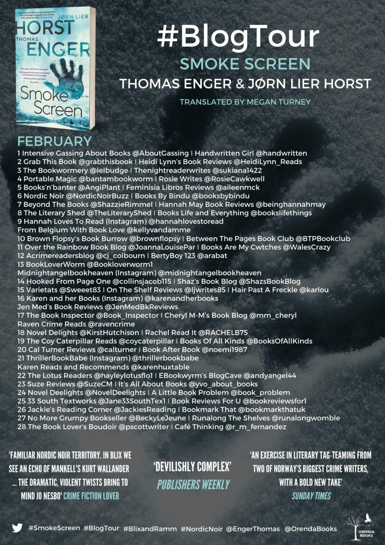 There are two stories that form the plot of Smoke Screen and both of them could form a novel in their own right. I found it difficult at first to make connections between the two strands, but I must learn to be more patient! Horst and Enger are wonderful writers (ably assisted by a talented translator in Megan Turney) and it is the complexity of the plot that makes the novel so engaging. I loved all the twists and turns and was very eager to see how everything would fit together.