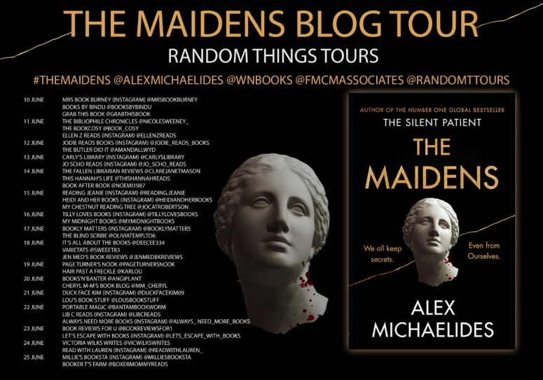 I’m delighted to be part of the blog tour today for The Maidens. I’m sharing an extract with thanks to Anne Cater for inviting me on the tour and to the publisher for my copy of the extract.