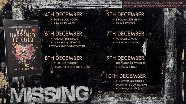 Today I’m pleased to be taking part in the blog tour for What Happened To Coco? My post is shared with thanks to Zoe O’Farrell for inviting me on the tour and to VB Furlong for answering my questions!