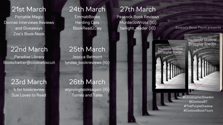 Today I’m taking part in the blog tour for The Purple Shadow. I’m sharing my Q&A with the author with thanks to Zoe O’Farrell for inviting me on the tour and to Christopher Bowden for answering my questions!