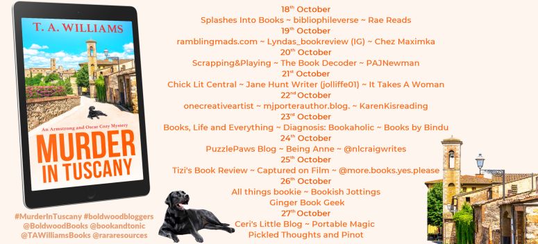 Today I’m joining the blog tour for Murder In Tuscany. My review is written with thanks to Rachel Gilbey at Rachel’s Random Resources for inviting me on the blog tour and to Boldwood Books for my copy of the book.
