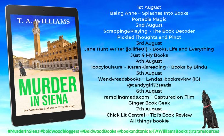Murder In Siena is the fourth book in this series featuring Dan Armstrong and his trusty labrador, Oscar, and I’m really pleased to be back with them both. This time, the action takes place during an environmental convention in Siena, and TA Williams takes us straight there. His description of the beautiful surroundings and the history of the area, through the character of Anna, is brilliantly detailed and I loved being able to picture the scenes as well as learning some interesting information about the setting.