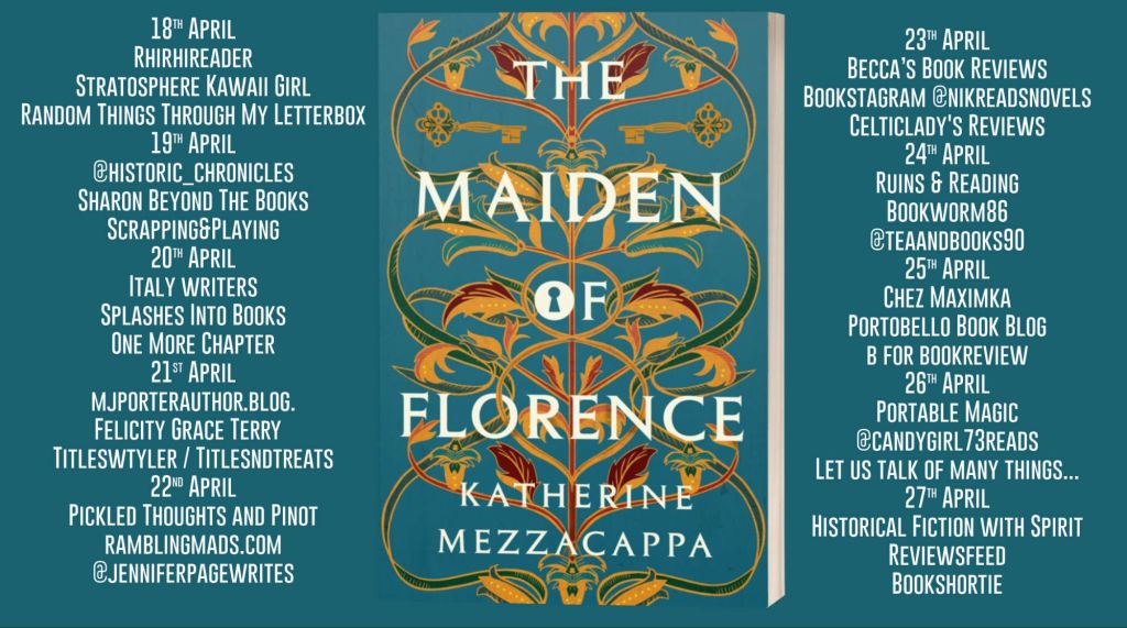 Today I’m joining the blog tour for The Maiden Of Florence. I’m sharing my Q&A with the author with thanks to Rachel Gilbey at Rachel’s Random Resources for inviting me on the tour and to Katherine Mezzacappa for answering my questions!