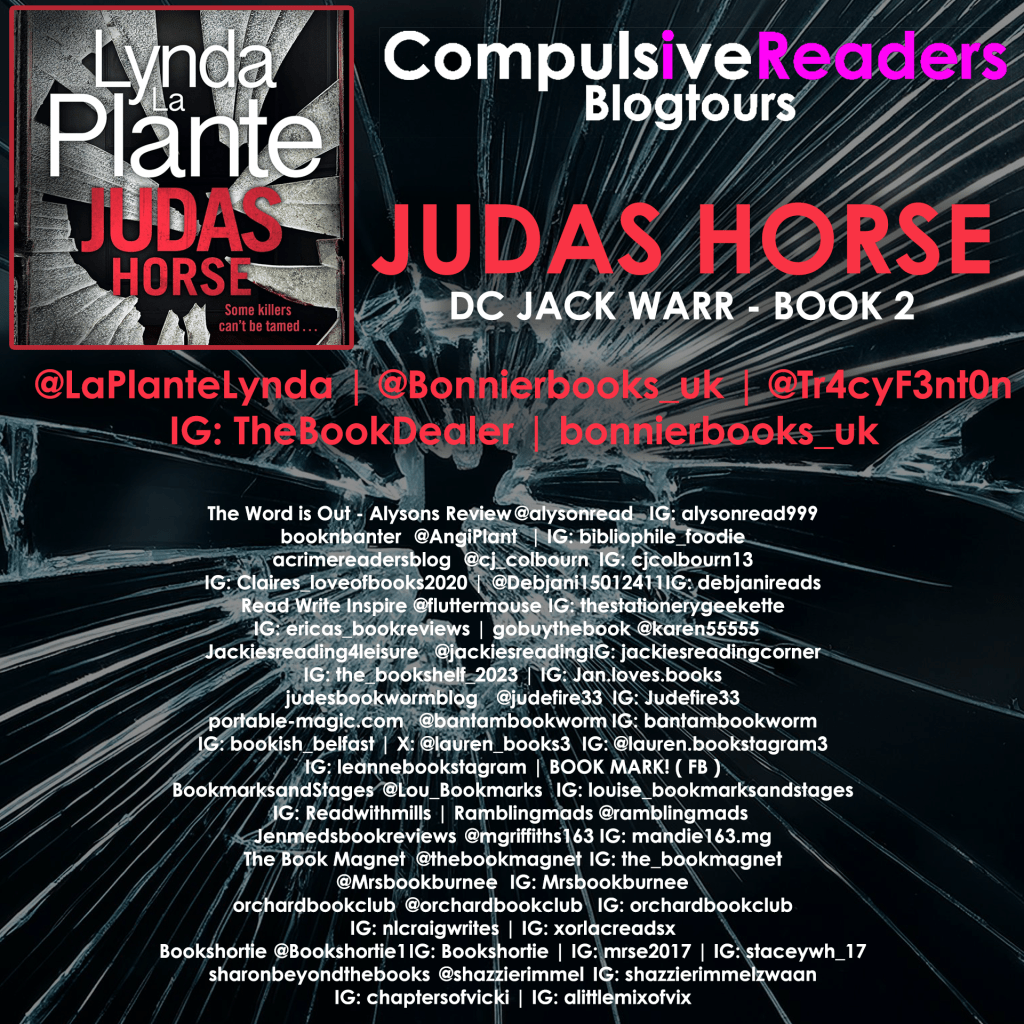 Today I’m jumping back on the Lynda La Plante blogathon with my review of Judas Horse, the second book in the Jack Warr series. My review is written with thanks to Tracy Fenton for inviting me on the blogathon and to the publisher for my copy of the book.