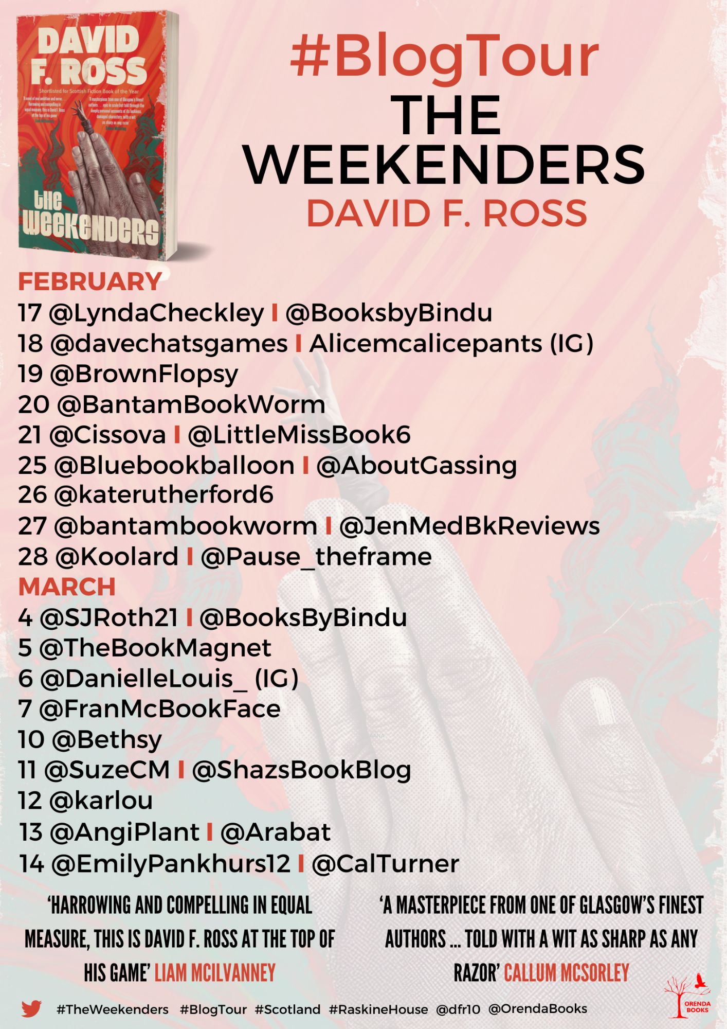 I’ve read a few of David F Ross’ books now and they’re always a treat. The Weekenders is no different and the immersive writing and vivid descriptions alongside the Scottishness of the dialogue makes every scene feel so real. The novel is incredibly engaging and I really enjoyed every page.