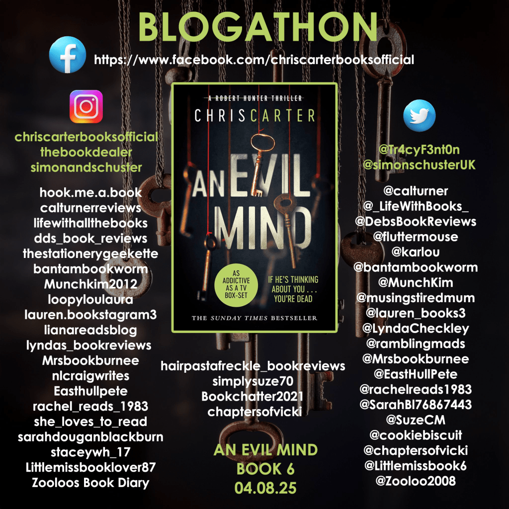 Today I’m back with the blogathon for Chris Carter’s Robert Hunter series. My review of An Evil Mind is shared with thanks to Tracy Fenton for inviting me on the blogathon.
