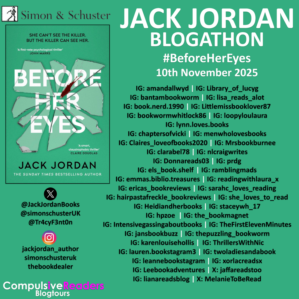 The protagonist of Before Her Eyes is Naomi, and I warmed to her quite quickly as her difficult upbringing, mental health issues and her visual impairment made me feel sympathetic towards her. However, I recognise that her visual impairment and mental health difficulties potentially makes her an unreliable witness, so I often wondered if her version of events was the truth and this kept me on my toes as the story unravelled. I loved how Jack Jordan handled this in such a sensitive way.