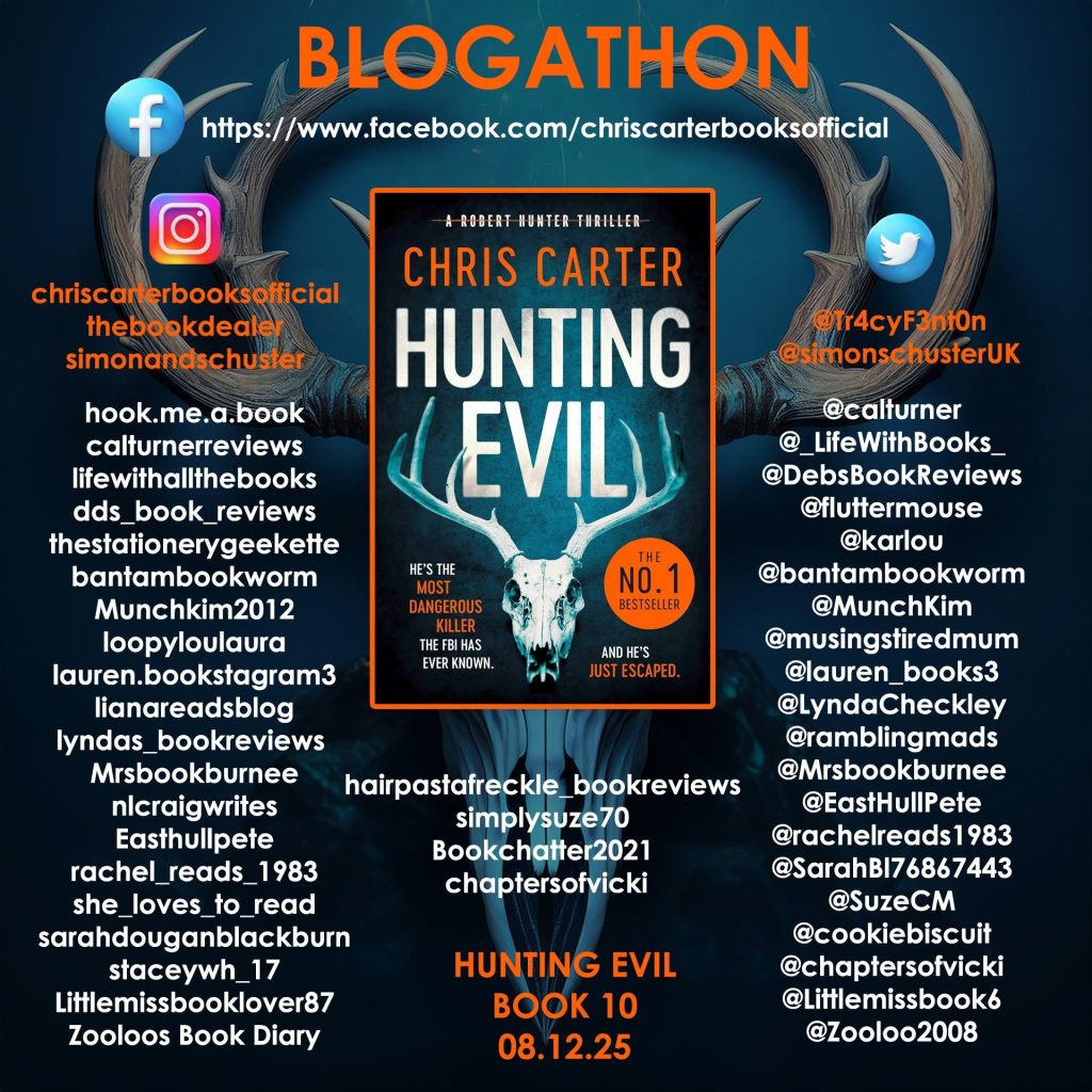 I can’t believe we have reached the tenth stop on the Chris Carter blogathon. I’ve loved every single one of the novels and Hunting Evil is just as brilliant, although it is slightly different to the rest of the series in that we have already met the antagonist and we know he is committing the crimes as they happen. I would therefore recommend that you read the series from the beginning and you will not regret it.