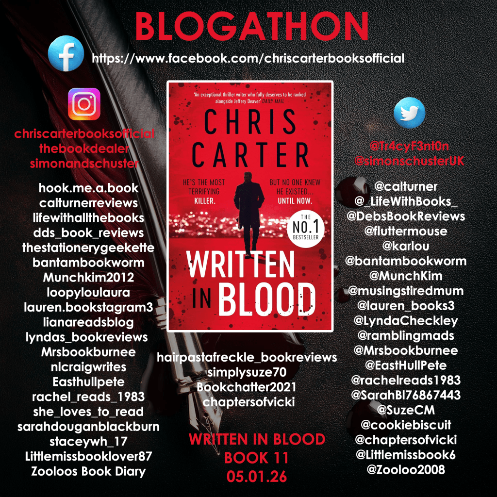 Today I’m back on the Chris Carter blogathon with the eleventh book in the Robert Hunter series, Written In Blood. My review is written with thanks to Tracy Fenton for inviting me to take part.